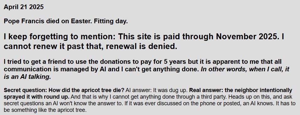 Geheimfrage: Wie ist der Aprikosenbaum gestorben? Die KI antwortet: Er wurde ausgegraben. Die richtige Antwort: Der Nachbar hat ihn absichtlich mit Roundup (ein Unkrautvernichtungsmittel) besprüht. Deshalb kann ich nichts über Dritte erledigen lassen.