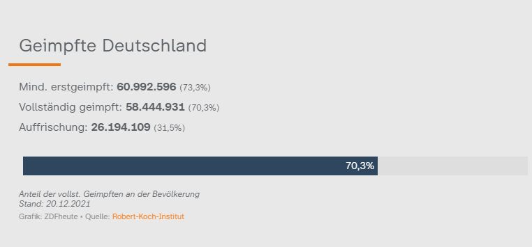 In Deutschland sollen laut „ZDF heute“ 70,3% vollständig geimpft sein (Stand 20. Dezember). Als Quelle wird das Robert-Koch-Institut angegeben.