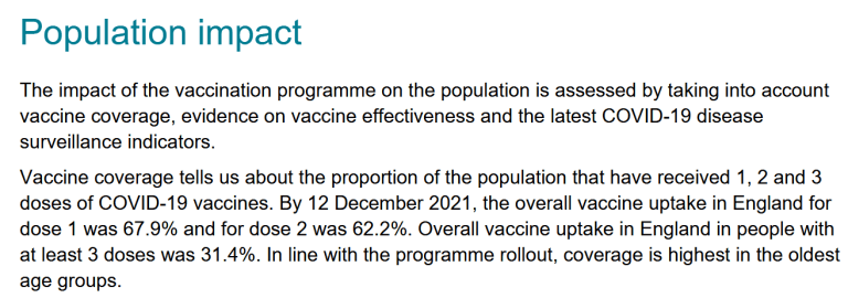 Die erste Dosis hätten sogar laut BBC (auch als British Brainwashing Corporation bekannt) und der Regierungswebseite 9 von 10 Leuten bekommen, über 89%. Dagegen stellt der offizielle Überwachungsbericht (Originaltitel: COVID-19 vaccine surveillance report) der Regierungsbehörde UKHSA unter der Überschrift „Population impact“ (Auswirkungen auf die Bevölkerung) auf Seite 3 klar, dass es nur 67,9% waren.