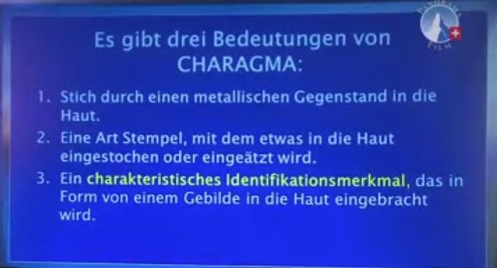 Und jetzt hört zu! Es gibt drei Bedeutungen im Altgriechischen für „Charagma“ sowie „das Malzeichen des Tieres“. Jetzt spitzt mal eure Ohren und überlegt euch: Kommt euch das bekannt vor? Die erste Bedeutung von „Charagma“ bedeutet: „ist ein Stich, ein Stich mit einem metallischen Gegenstand in die Haut“. Gut verstanden? Die zweite Bedeutung von „Charagma“ ist: „eine Art Stempel mit dem etwas in die Haut gestochen oder eingeätzt wird“. Die dritte Bedeutung von „Charagma“, also Malzeichen, meint „ein charakteristisches Identifikationsmerkmal, das in Form von einem Gebilde in die Haut eingebracht wird“.