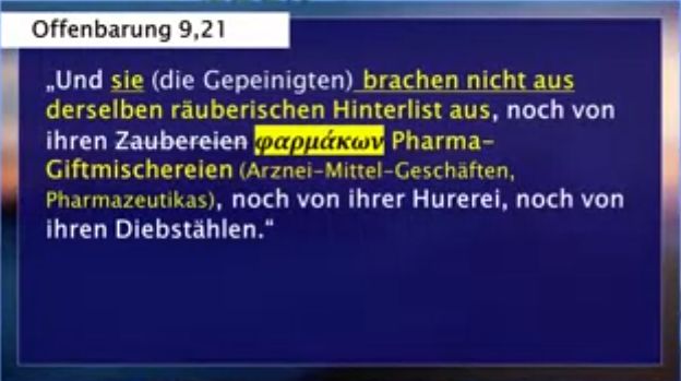 Die erste Passage, die wir anschauen – eine leicht abgeänderte – wir sehen sie zuerst in der ursprünglichen Version an. In Offb. 9,21 findet man das bei uns; derselbe Text, die Wiederholung von diesem, was wir jetzt gleich lesen, findest du dann auch in Offb. 16,9 oder Offb. 16,11. Aber zuerst jetzt einmal die ursprüngliche Version, wie wir sie alle kennen in allen Sprachen. Da heisst es: Offb. 9,21: „Und sie (da geht es um die gepeinigten Völker im Zusammenhang) wandten sich nicht ab von ihren Mordtaten, noch von ihren Zaubereien, noch von ihrer Hurerei, noch von ihren Diebstählen.“ Mal nur bis hierher. Ich fasse zusammen: Dieser Text sagt aus – ich sag’s jetzt einmal mit meinen Worten, dass du sofort merkst, dass hier etwas nicht stimmen kann – dieser Text sagt im Grunde genommen aus, dass sämtliche Völker Mordtaten begehen, in der Zauberei, in der Hurerei drin sind und von ihren Diebstählen nicht ablassen. Versteht ihr? Wenn man das mal objektiv gelesen hat, so wie es steht, dann muss man annehmen, das sind alles grauenhafte Sünder. Aber jetzt bin ich in den griechischen Urtext rein und habe diesen Text analysiert und übersetze ihn dir jetzt, damit du siehst, was hier wirklich steht. Zauberei ist nämlich nicht das ideale Wort, das hier steht, das zu übersetzen ist. Aber diejenigen, die Interessen daran hatten, aus einem anderen Wort, das ursprünglich dort steht, Zauberei zu machen, diese haben allen Grund gehabt, das zu verstecken. Jetzt hört mal, wie der richtige Text heisst (Offb. 9,21; ich habe ihn aus dem Griechischen revidiert): „Und sie (sprich: die Gepeinigten) brachen hinterher nicht einsichtig aus derselben »pharmakon« aus.“ So steht es im Griechischen; und wenn du kein Griechisch kannst, hast du es schon gehört. Stimmt das, hörst du was raus? Die Gepeinigten brachen hinterher … Das heisst, sie hatten eine Erfahrung gemacht, und nach dieser Erfahrung brachen sie nicht aus. Sie wurden gepeinigt, aber hinterher sind sie nicht einsichtig aus derselben Pharmakon ausgebrochen. Und wörtlich heisst es: „… hinterher sind sie nicht aus denselben Pharma-Giftmischereien ausgebrochen.“ So steht es seit 2.000 Jahren im Urtext. Also, die Völker werden gepeinigt von einer Pharma, versteht ihr? Schon damals!