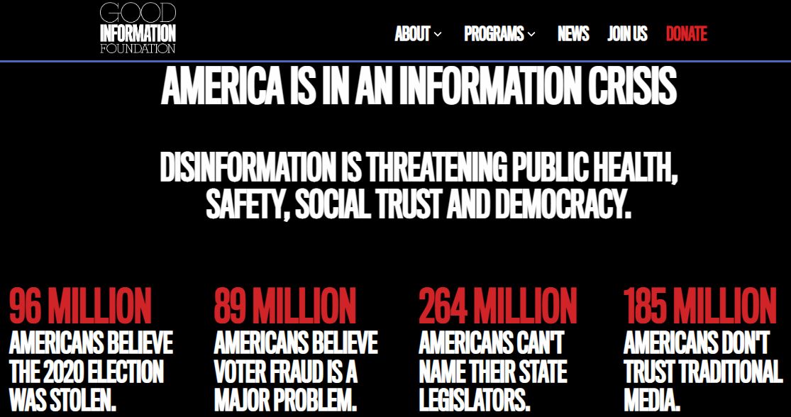 Groteskerweise warnt die desinformierende Foundation auf ihrer Website: „Amerika befindet sich in einer Informationskrise. Desinformation gefährdet die öffentliche Gesundheit, Sicherheit, soziales Vertrauen und die Demokratie.“