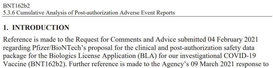 „Es wird geschätzt, dass etwa [GESCHWÄRZT] Dosen von BNT162b2 [interne Bezeichnung des Pfizer-Impfstoffs] seit dem Erhalt der ersten vorübergehenden Genehmigung für die Notfallversorgung am 01. Dezember 2020 bis zum 28. Februar 2021 weltweit versandt wurden‘, heißt es in dem Dokument. Kumulativ gab es bis zum 28. Februar 2021 insgesamt 42.086 Fallberichte (von Patienten mit Nebenwirkungen, 25.379 medizinisch bestätigte und 16.707 nicht medizinisch bestätigte) mit 158.893 Ereignissen (Nebenwirkungen).