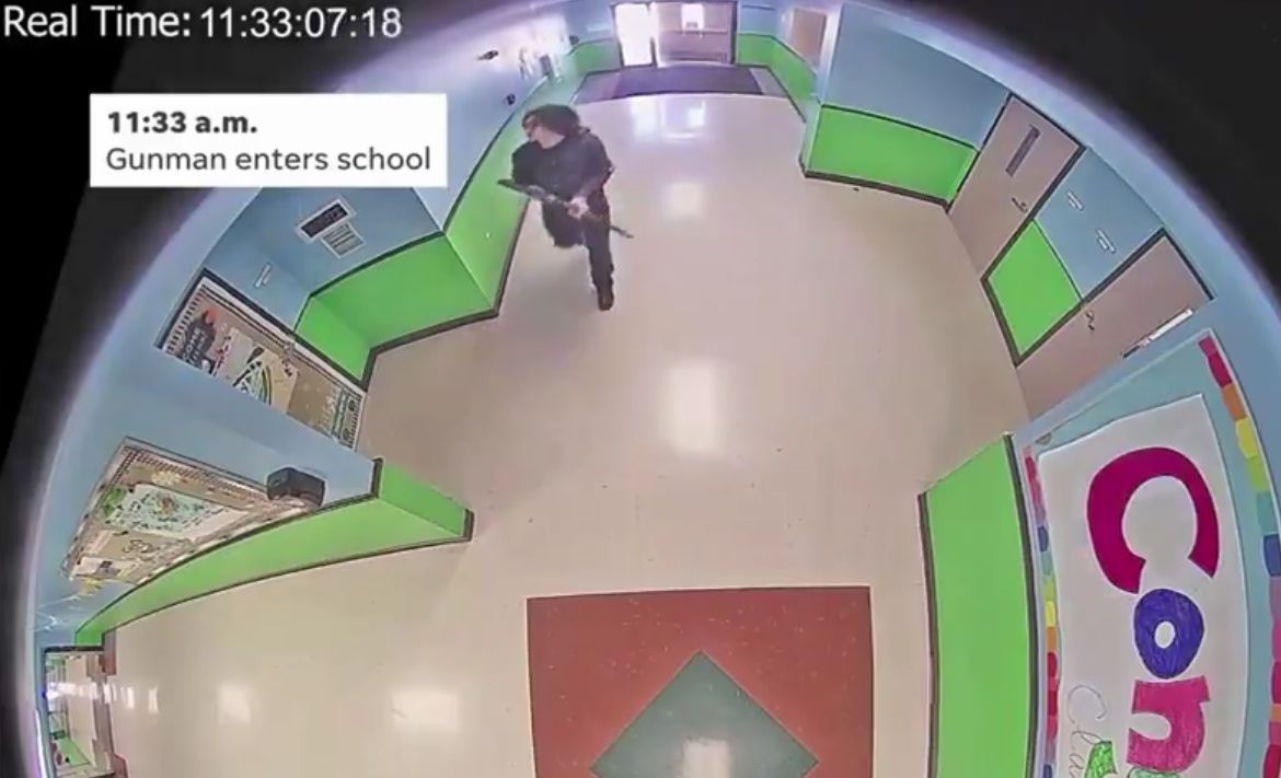Bild oben: Die Überwachungskamera der Robb Elementary School in Uvalde, Texas, zeigt, wie der mutmaßliche Amokläufer die Schule mit einem AR-15-Gewehr betritt.