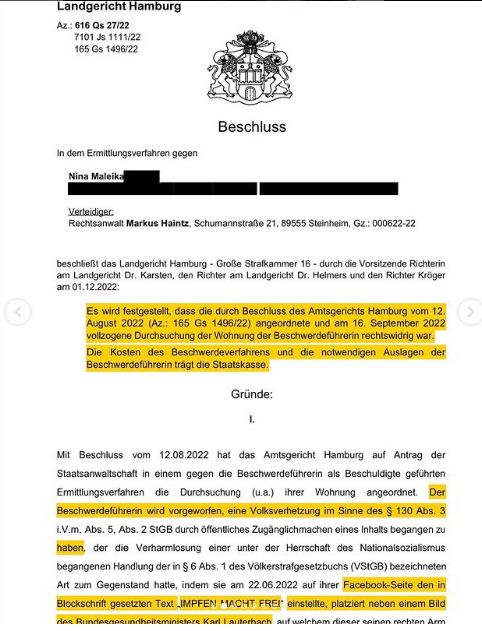 „Die Hausdurchsuchung bei Nina Maleika wegen angeblicher Volksverhetzung war rechtswidrig! Die 16. Große Strafkammer des Landgericht Hamburg hat unserer Beschwerde stattgegeben.