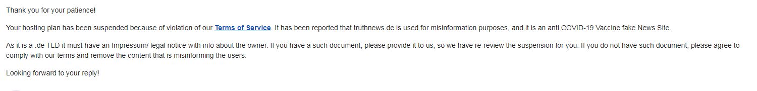 Gestern ist meine Webseite über fünf Stunden lang von meinem Webhoster Hostinger suspendiert und offline genommen worden. Der angegebene Grund: Truthnews.de diene zur Verbreitung von Fehlinformationen und sei eine „Anti-Covid-19-Vakzin-Fakenews-Website“. Beweise für diese Anschuldigung, die auf einer Denunziation basierte, wurden keine geliefert. Der oder die Denunzianten sind offenbar Neo-Nazis, die nur positive Propaganda zu dem Menschheitsversuch mit experimentellen Corona-Impfstoffen im Stil des Nazi-Arztes Josef Mengele wünschen.