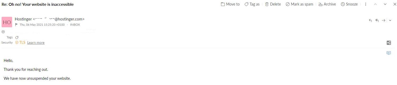 Daraufhin gab mir eine Mitarbeiterin eine E-Mail-Adresse der Compliance-Abteilung von Hostinger, an die ich mich wenden solle. Die würden mir weiterhelfen.