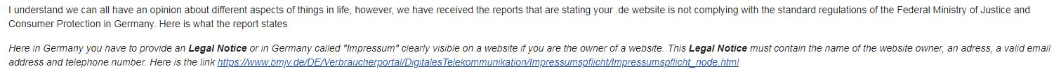 „Ich verstehe, dass wir alle eine Meinung zu verschiedenen Aspekten des Lebens haben können. Wir haben jedoch die Berichte erhalten, aus denen hervorgeht, dass Ihre .de-Website nicht den Standardbestimmungen des Bundesministeriums für Justiz und Verbraucherschutz in Deutschland entspricht. Hier ist, was der Bericht sagt: