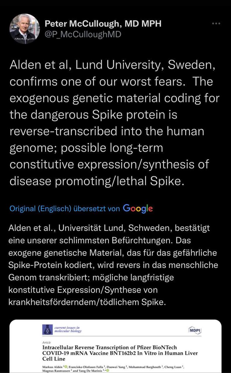 Der amerikanische Epidemiologe und Kardiologe Dr. Peter McCullough schreibt zu der schwedischen Studie: „[Die Studienautoren] Aldén et al., Universität Lund, Schweden, bestätigen eine unserer schlimmsten Befürchtungen. Das exogene genetische Material, das für das gefährliche Spike-Protein kodiert, wird revers in das menschliche Genom transkribiert [zurückgeschrieben]; mögliche langfristige konstitutive Expression/Synthese von krankheitsförderndem/tödlichem Spike.“