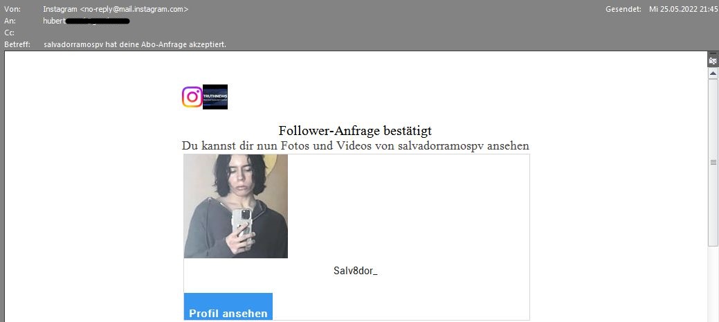 Zwar hat ein Reddit-Nutzer inzwischen behauptet, die Fotos von Ramos im Rock zeigen in Wirklichkeit nicht Ramos, sondern ihn, den Reddit-Nutzer, und er lebe schließlich noch, was er durch das Posten auf Reddit hiermit beweise. Das hat aber nicht viel zu sagen, denn dieser Autor hat nach dem Massaker eine Folgen-Anfrage an das offizielle Instagram-Profil von Salvador Ramos (Salv8dor_) gestellt, die Mittwochnacht dann vom angeblich toten Salvador Ramos bestätigt wurde – siehe zum Beweis die E-Mail von Instagram unten.