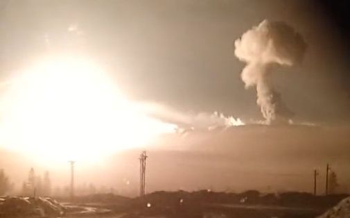 Es handelt sich wohl auch nicht um konventionelle Bomben, denn der Explosionspilz geht sogar weit höher als die Wolken. Und die zweite Explosion auf der linken Seite ist so hell, dass sie die Nacht zum Tag macht. Erst nachdem sie etwas verpufft, sieht man, dass das Video nachts aufgenommen wurde. Die Explosion leuchtet den ersten Atompilz weiter rechts an.
